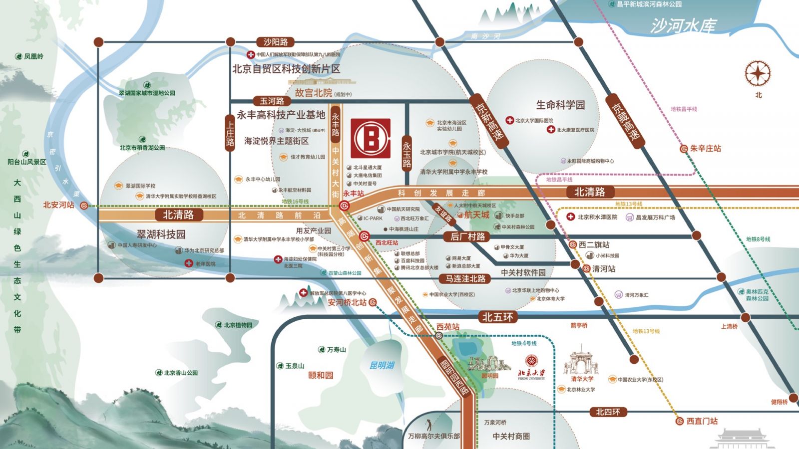 中海·滙德里所在的海淀永丰,位于“北清路前沿科创发展走廊”和“中关村大街高端创新集聚发展走廊”的核心,周边环绕中关村永丰产业基地、中关村生命科学园、中关村软件园、中关村环保园、中关村创新园等产业园区。聚集着华为、腾讯、网易、甲骨文、大唐电信、航天电子、北斗导航、用友软件、中国船舶等众多世界500强企业,是海淀最具潜力和活力的科技创新封面。